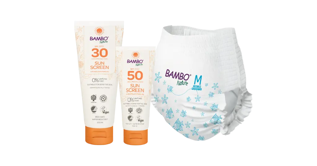 S kremo za zaščito pred soncem in plavalnimi hlačkami Bambo Nature bo vaš otrok zaščiten, nasmejan in zadovoljen – na vseh vaših dogodivščinah, najsi bo to na plaži, v bazenu ali na domačem vrtu.